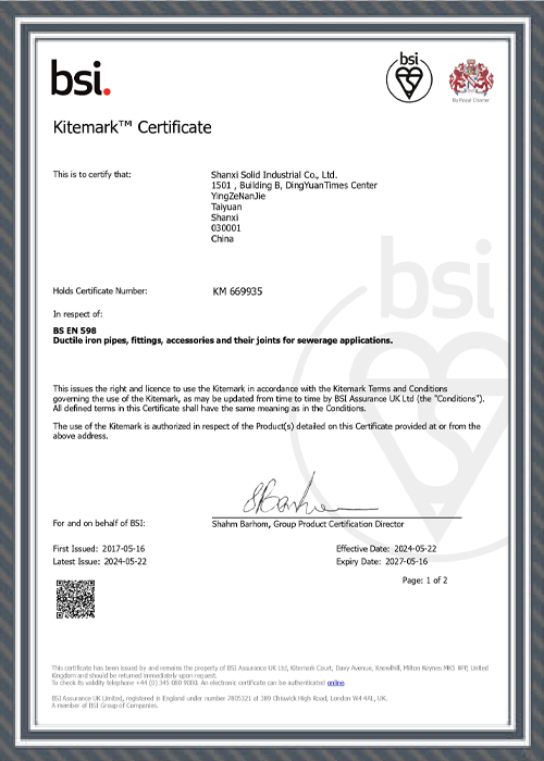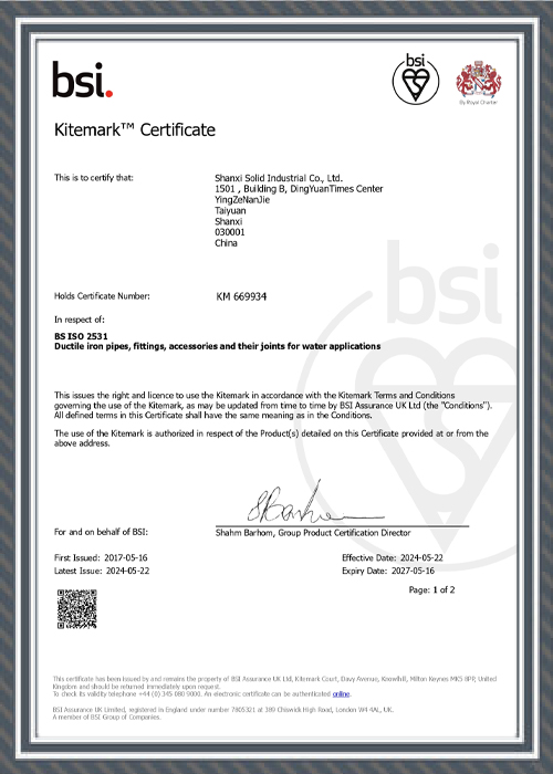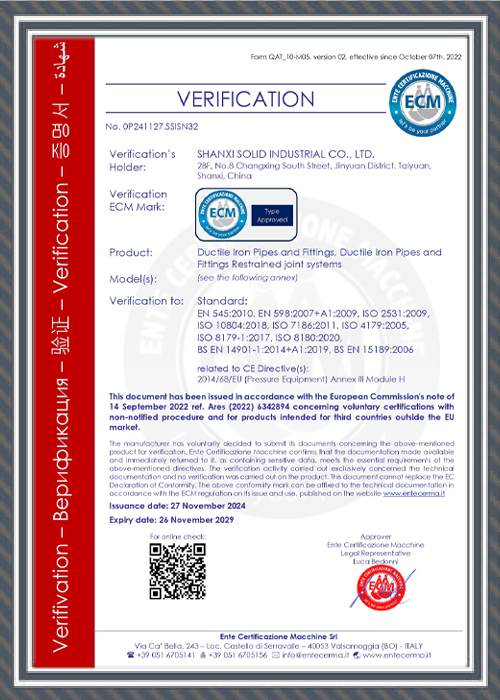 Shanxi Solid Industrial Co., Ltd. is located in the heavy industry province of Shanxi, China with rich resources of pig irons, coke, steel and other industrial raw materials, we are one of the leading manufacturers of Ductile iron pipes, Ductile Iron Pipe Fittings, Flange Adaptors, Couplings, Dismantling Joints, Valves, Manhole Covers, Steel Flanges, Carbon steel pipe fittings, malleable iron pipe fittings, Rubber O rings, Fasteners. Pumps, Motor Shells and other Castings and Forgings according to different standards such as ISO2531, EN545, EN14525, ISO4422, ISO7005, DIN3352, BS5163, DIN3202, BS2494, BS4504, EN124 and other relevant ISO, EN, BS, DIN, ANSI, AWWA standards.